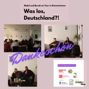 Danach luden wir zum Live-Event: „Was los, Deutschland?! Gerade jetzt!“ und freuten uns über den Besuch von Abdul Kader Chahin und Burak Yılmaz im real talk im Jugendbeteiligungsraum „InnerSpace“ in Bremerhaven.